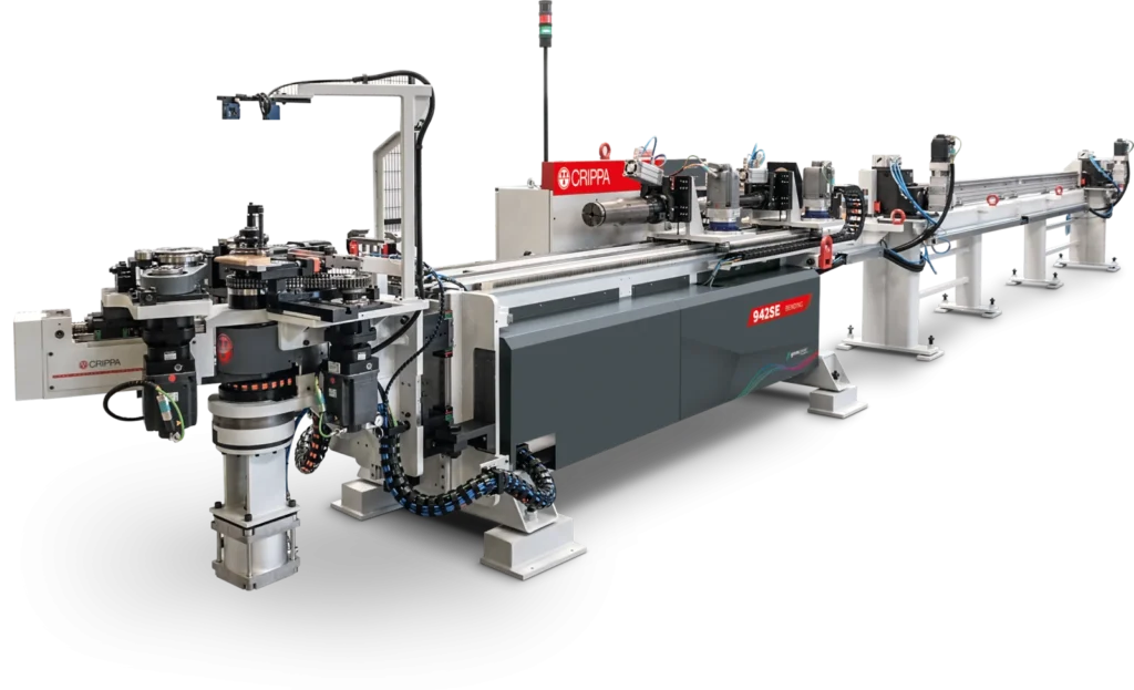 Los sectores de calefacción y aire acondicionado, tanto civiles como industriales, han avanzado significativamente en los últimos años gracias a la disponibilidad de nuevas tecnologías (como las calderas de condensación) y a las exigencias medioambientales de eficiencia energética y reducción de la contaminación. Para satisfacer estas demandas, adoptamos un enfoque técnicamente más complejo mediante el diseño de un producto específico: la 942SE, una dobladora de tubos diseñada para fabricar bobinas personalizadas a partir de una bobina de tubo. La 942SE es la respuesta de CRIPPA a estas exigencias medioambientales, fruto de décadas de experiencia en el sector de la climatización. Un sistema patentado de carga de tubos desde la parte posterior de la máquina y el doblado de tubos con el mandril garantizan un control activo, precisión y plegados de calidad durante todo el proceso. Siemens SINUMERIK 840D sl controla los dos ejes de accionamiento de los tubos, mientras que el avance trasero se acciona mediante rodillos motorizados. La máquina también cuenta con un posicionador frontal doble para garantizar un empuje constante, optimizando así el tiempo de ciclo. El dispositivo de apertura vertical de los cabezales de doblado facilita la fase de descarga y el procesamiento de perfiles no circulares. La máquina cuenta con un mínimo de 10 ejes controlados y un diseño modular capaz de procesar perfiles muy largos con empuje continuo. La 942SE también está diseñada para integrarse en el sistema “Smart Factory”.